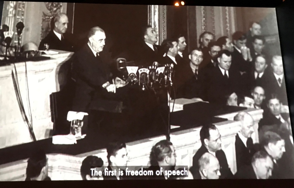 Photo credit: I took the photo above of a documentary film showing at a special exhibit titled “Enduring Ideals: Rockwell, Roosevelt & the Four Freedoms” at The Henry Ford Museum in Dearborn, Michigan. See the post Legacy of the Four Freedoms for more discussion about this exhibit. Photo taken October 19, 2018.