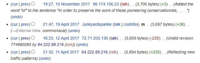 The change on 12 April 2017 was me. I am identified only by my Internet Protocol (IP) address for that session: 72.71.203.136. Interestingly, the material that I deleted had been added less than 24 hours previously by an anonymous person at IP address 64.222.89.216. The timing was pure luck, but I wonder if the purveyor of that “fake news” was surprised by how quickly it was corrected.