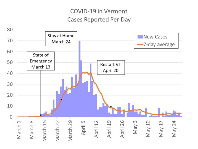 • May 4: Authorized the Vermont Department of Health (VDH) to develop guidelines for elective medical procedures to resume. (Phase IV? Not identified as such.)