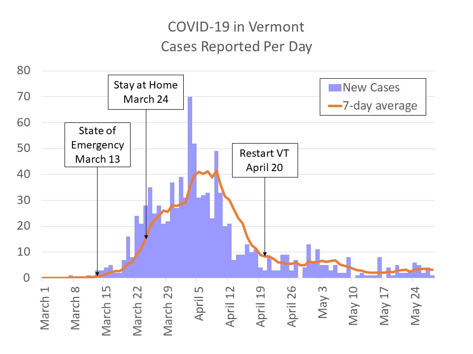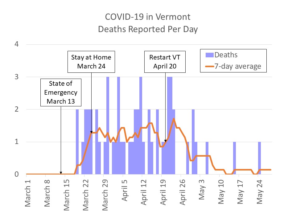 The following graphs are from the post COVID-19 in Vermont on my other blog, with key events noted on the timeline:At the time of the “Stay Home/Stay Safe” order on March 24 (Addendum 6), we were still on the upward slope of the curves, and we did not know how bad things would become. As it turned out, the 7-day average of new cases peaked on April 9 (at 41.4) and the 7-day average of deaths peaked on April 23 (at 1.7).