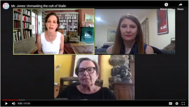 The moderator (upper left) is Anne Applebaum: “an American journalist and historian. She has written extensively about Marxism-Leninism and the development of civil society in Central and Eastern Europe.” She wrote the 2017 book Red Famine: Stalin’s War on Ukraine, so she is a subject matter expert on the Holodomor, the focus of Mr. Jones.