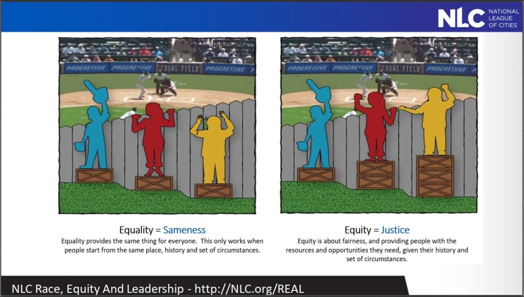 The concept of “equity” as it is used in the DEI movement was new to me. The following graphic from the National League of Cities explains their definition of “equity” by contrasting it with their definition of “equality” (source: REAL 100 Webinar slide 28):
